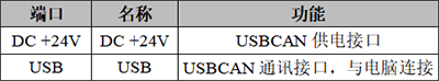 USBCAN-Modul 8接口卡使用DC+24V直流電源供電,USB接口作為通訊接口,因此在使用時需將DC+24V和USB一起接入。