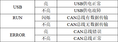 USB接口及電源接口連接,打開供電開關(guān),供電正常后,PWR指示燈會亮;當(dāng)CAN端有數(shù)據(jù)傳輸時相應(yīng)通道的RUN燈會亮;當(dāng)CAN總線產(chǎn)生錯誤時ERR會亮。