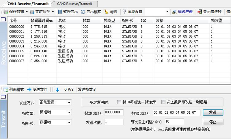 接收和發(fā)送界面是ECANTools的主要功能,在此界面,用戶可以直觀的看到接收到的CAN報文,以及通過普通發(fā)送或列表發(fā)送的方式,向總線上發(fā)送數(shù)據(jù)。