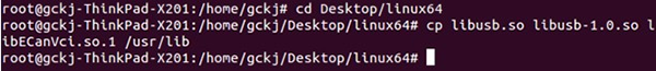 4、進(jìn)入USBCAN驅(qū)動文件夾,拷貝libusb.so、libusb-1.0.so、libECanVci.so.1到gcc編譯庫目錄下。(默認(rèn)路徑為/usr/lib)輸入:cp libusb.so libusb-1.0.so libECanVci.so.1/usr/lib(默認(rèn)路徑為/usr/lib)