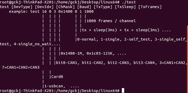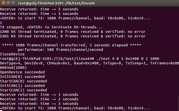 7、運行測試程序測試USBCAN收發(fā)。輸入:./test