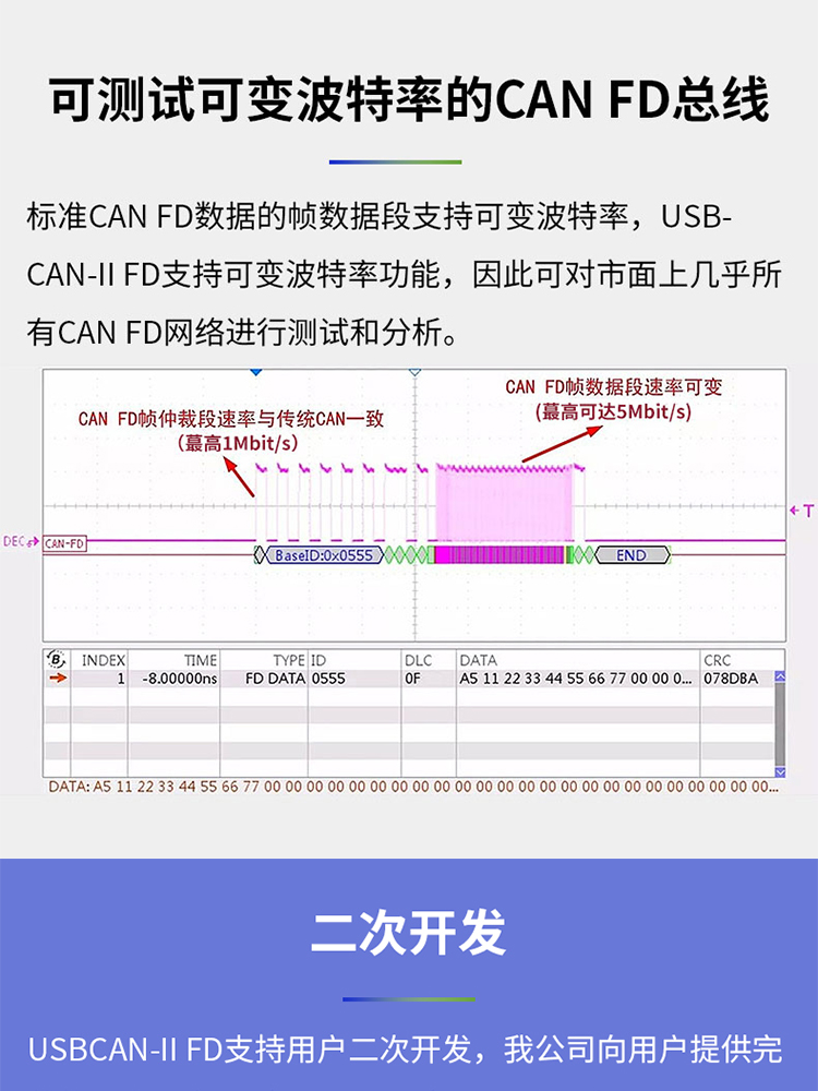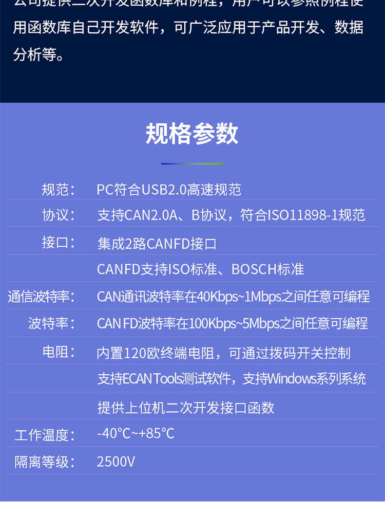 (1)PC接口符合USB2.0全速規(guī)范,兼容USB1.1及USB3.0;(2)集成2路CANFD接口,使用插拔式端子接線方式;(3)支持CAN2.0A/B協(xié)議,符合ISO 11898-1規(guī)范;(4)CAN通訊波特率在40Kbps~1Mbps之間任意可編程;(5)CANFD通訊最高波特率可支持到5M;(6)使用USB總線電源供電,或使用外接電源(DC+5V,130mA);(7)CAN(FD)-bus接口采用電氣隔離,隔離模塊絕緣電壓:DC 2500V;(8)最高接收數(shù)據(jù)流量:14000 fps;(9)CAN端接收報文時間戳精度可達1us;(10)支持Windows XP、7、8、10等Windows操作系統(tǒng);(12)支持ECANTools測試軟件;(13)支持二次開發(fā);(14)工作溫度范圍:-40℃~+85℃。- 產(chǎn)品介紹視頻: