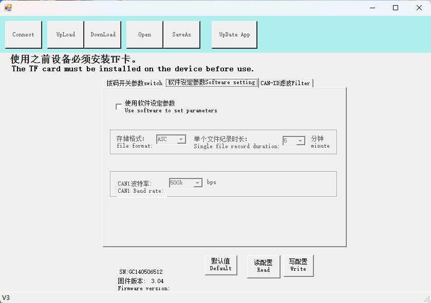 請(qǐng)注意:.DAT格式文件建議保存成每分鐘一個(gè)文件,避免造成數(shù)據(jù)損壞丟失;勾選“使用軟件設(shè)定參數(shù)”之后以軟件配置為準(zhǔn),設(shè)備硬件撥碼撥到數(shù)字一側(cè)。