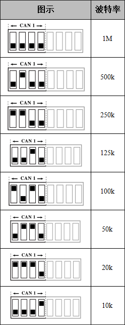 系統(tǒng)先不要上電,撥碼開(kāi)關(guān)的“1、2、3、4”號(hào)可以對(duì)CAN總線波特率進(jìn)行配置,端子(5、8)有特殊定義,默認(rèn)朝下,請(qǐng)勿隨意設(shè)置。撥碼開(kāi)關(guān)向下默認(rèn)為0,具體各波特率詳見(jiàn)下表。