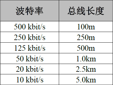 注意:CAN電纜可以使用普通雙絞線、屏蔽雙絞線。理論最大通信距離主要取決于總線波特率,最大總線長(zhǎng)度和波特率關(guān)系詳見(jiàn)下表。若通訊距離超過(guò)1Km,應(yīng)保證線的截面積大于Φ1.0mm2,具體規(guī)格應(yīng)根據(jù)距離而定,常規(guī)是隨距離的加長(zhǎng)而適當(dāng)加大。