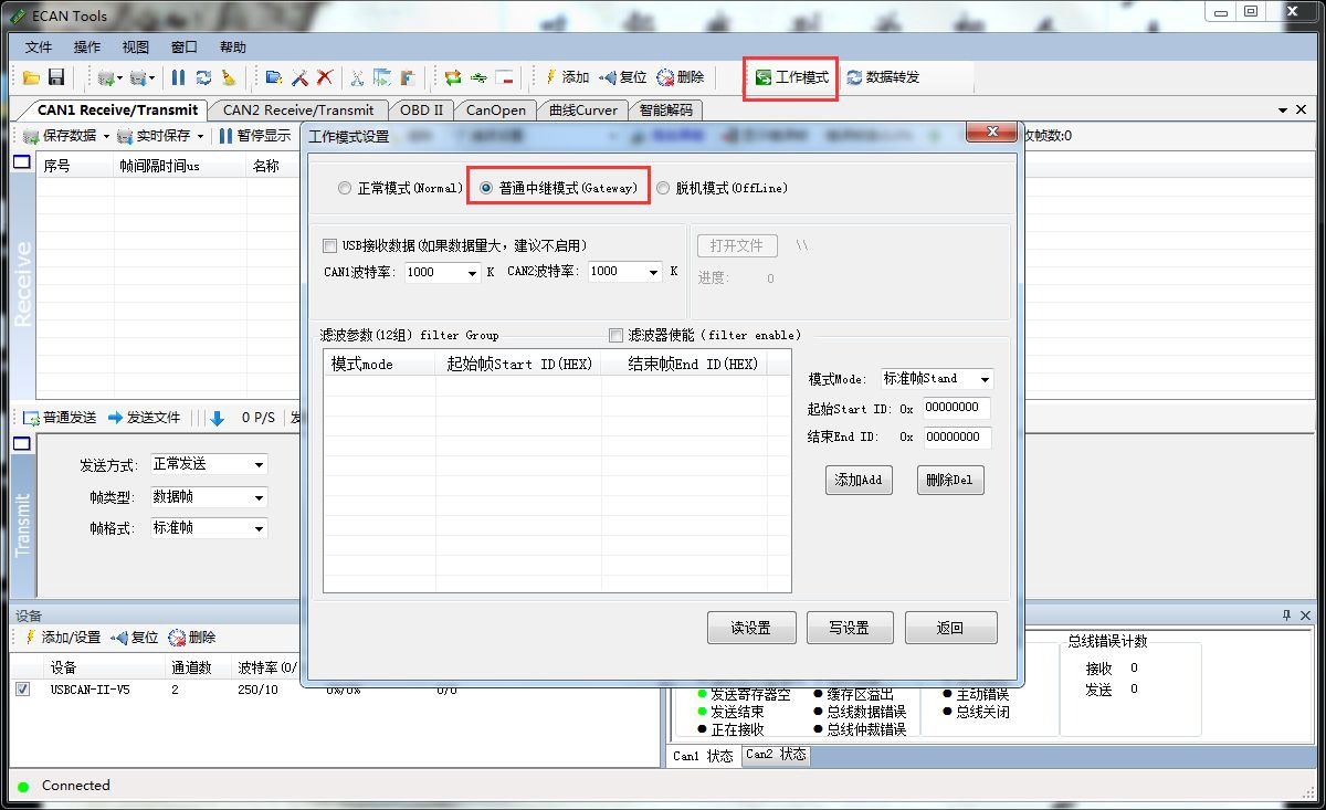用戶在使用GCAN-206模塊中繼功能時,使用ECANTools軟件將設備工作模式切換為中繼模式即可。本章將對ECANTools主要功能做介紹。