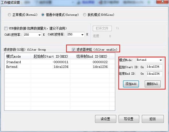 勾選濾波器使能,添加Add,使用中繼濾波功能??梢酝瑫r設置標準幀或者擴展幀,濾波參數(shù)最多12組。如圖中繼濾波配置流程。