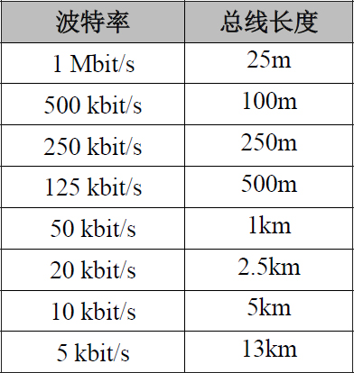 注意:CAN總線電纜可以使用普通雙絞線、屏蔽雙絞線。理論最大通信距離主要取決于總線波特率,最大總線長度和波特率關系詳見下表。若通訊距離超過1Km,應保證線的截面積大于Φ1.0mm2,具體規(guī)格應根據(jù)距離而定,常規(guī)是隨距離的加長而適當加大。