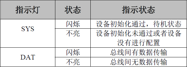 GCAN-206模塊具有1個SYS指示燈,用來指示設備的運行狀態(tài),1個DAT指示燈,用來指示數(shù)據(jù)傳輸。這2個指示燈的具體指示功能見下表,這2個指示燈處于各種狀態(tài)下時,CAN總線的狀態(tài)如下表所示。