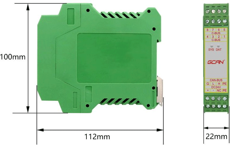 設(shè)備外形尺寸:(長,含接線端子)112mm*(寬)22mm*(高)100mm,其示意圖如圖所示。
