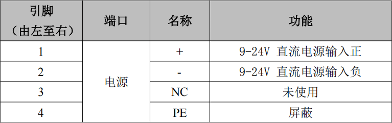 GCAN-204模塊的電源接口由1個4 Pin插拔式接線端子引出,其接口定義如表所示。