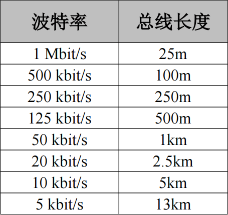注意:CAN總線電纜可以使用普通雙絞線、屏蔽雙絞線。理論最大通信距離主要取決于總線波特率,最大總線長度和波特率關(guān)系詳見下表。若通訊距離超過1Km,應保證線的截面積大于Φ1.0mm2,具體規(guī)格應根據(jù)距離而定,常規(guī)是隨距離的加長而適當加大。