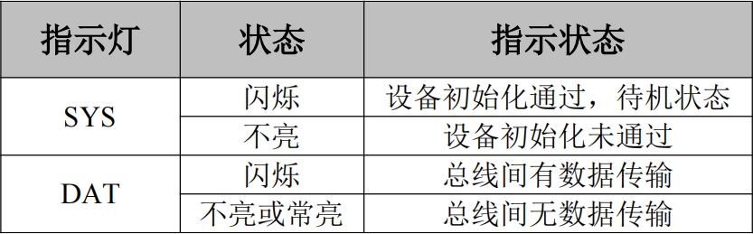 GCAN-204模塊具有1個SYS指示燈,用來指示設(shè)備的運行狀態(tài),1個DAT指示燈,用來指示數(shù)據(jù)傳輸。這2個指示燈的具體指示功能見下表,這2個指示燈處于各種狀態(tài)下時,CAN總線的狀態(tài)如表所示。