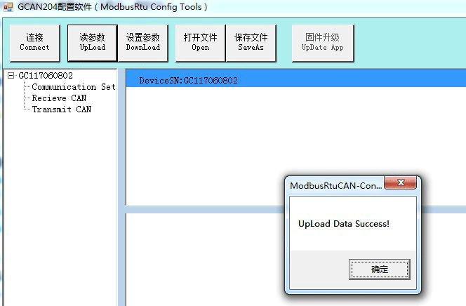 打開軟件后,選擇連接到GCAN-204的串口號,點擊“連接Connect”即可建立連接。如用戶不知道串口號,可通過進入PC機的設(shè)備管理器中查看,配置軟件中顯示的串口號是1-7,如果超過這個顯示范圍,請客戶自行修改串口號。建立連接后點擊“讀參數(shù)Upload”可以讀出模塊當前的配置情況,如圖所示。