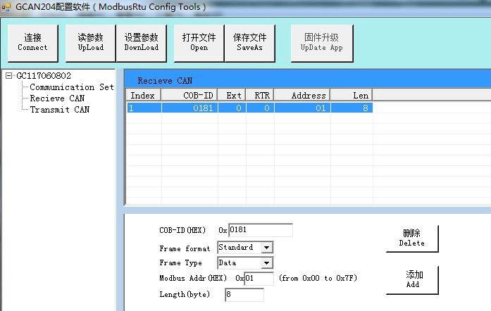 GCAN-204模塊可將接收到的指定幀ID的CAN數(shù)據(jù),按照設(shè)置好的對應關(guān)系緩存在Modbus RTU的地址表中,等待Modbus指令讀取。