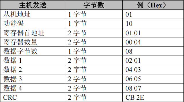 例如:配置Modbus從站地址為1,Modbus寄存器首地址為0x101(十進制為257,此值為出廠預設(shè)值),功能碼為16(10H),CAN為標準幀,幀ID為0x201,CAN幀數(shù)據(jù)為0x01,0x02,0x03,0x04,0x05,0x06,0x07,0x08。用戶Modbus主站發(fā)送請求幀:01 10 01 01 00 04 08 02 01 04 03 06 05 08 07 CB 2E