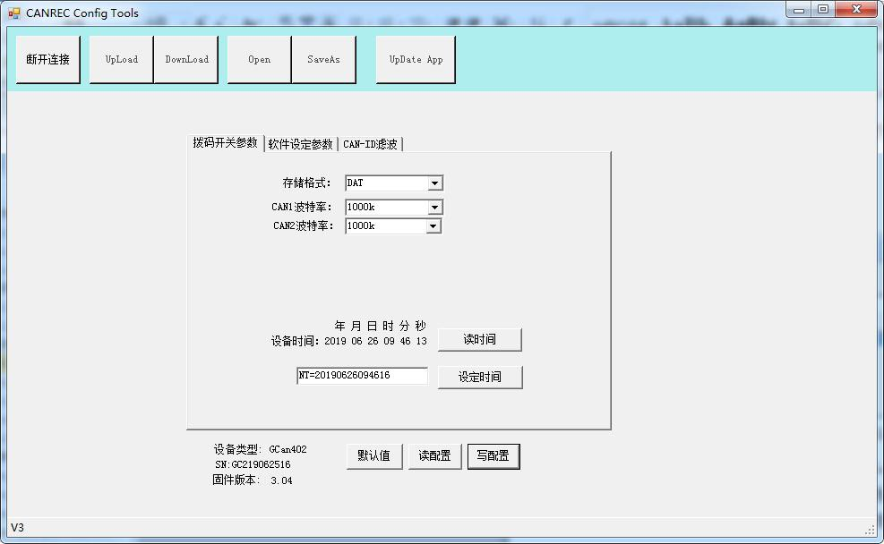 CAN總線數(shù)據(jù)存儲(chǔ)器已經(jīng)集成了系統(tǒng)時(shí)鐘,真實(shí)、準(zhǔn)確的系統(tǒng)時(shí)鐘及文件系統(tǒng)使模塊可以按天存儲(chǔ)并管理數(shù)據(jù),即每天按日期新建文件夾,將當(dāng)天存儲(chǔ)的數(shù)據(jù)自動(dòng)的存入對(duì)應(yīng)的文件夾中。模塊會(huì)在當(dāng)天的文件夾中每分鐘新建一個(gè)文件,將這一分鐘收到的數(shù)據(jù)保存到對(duì)應(yīng)的文件中。如模塊出廠時(shí)間不準(zhǔn)確則需要用戶自行校對(duì)系統(tǒng)時(shí)間,系統(tǒng)時(shí)間界面如圖所示,可以通過(guò)點(diǎn)擊讀時(shí)間按鍵,來(lái)讀取設(shè)備的系統(tǒng)時(shí)間,修改設(shè)定時(shí)間前的參數(shù)修改為:“NT=XXX”。舉例:發(fā)送“NT=20190626094616”,則會(huì)將系統(tǒng)時(shí)間修改為2019年6月26日09時(shí)46分16秒,點(diǎn)擊設(shè)定時(shí)間。