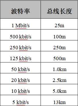 注意:CAN電纜可以使用普通雙絞線、屏蔽雙絞線。理論最大通信距離主要取決于總線波特率,最大總線長(zhǎng)度和波特率關(guān)系詳見(jiàn)表。若通訊距離超過(guò)1Km,應(yīng)保證線的截面積大于Φ1.0mm2,具體規(guī)格應(yīng)根據(jù)距離而定,常規(guī)是隨距離的加長(zhǎng)而適當(dāng)加大。