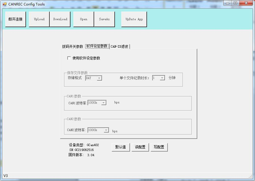 軟件配置參數(shù)界面如圖所示,用戶可以通過(guò)圖3.3所示的界面,讀取設(shè)備撥碼開(kāi)關(guān)設(shè)定的參數(shù),勾選使用軟件設(shè)定參數(shù)之后生效,GCAN-402D模塊支持20k-1000k全范圍波特率,CAN總線數(shù)據(jù)存儲(chǔ)器支持四種保存數(shù)據(jù)格式:二進(jìn)制文件(.DAT)、文本文件(.TXT)、Vector軟件可導(dǎo)入文件(.ASC)、批處理文件(.CAN),GCAN-402D默認(rèn)是每分鐘新建一個(gè)文件,將這一分鐘收到的數(shù)據(jù)保存到對(duì)應(yīng)的文件中,可以通過(guò)修改單個(gè)文件記錄時(shí)長(zhǎng)修改單個(gè)文件保存的數(shù)據(jù)時(shí)間。軟件配置參數(shù)設(shè)置