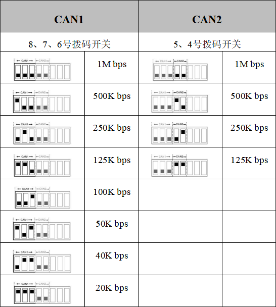 系統(tǒng)先不要上電,撥碼開(kāi)關(guān)的“8、7、6、5、4”號(hào)可以分別對(duì)CAN1和CAN2波特率進(jìn)行配置,端子1有特殊定義,默認(rèn)朝上,請(qǐng)勿隨意設(shè)置。撥碼開(kāi)關(guān)向上默認(rèn)為0,向下為1(ON),具體各波特率說(shuō)明如表所示。