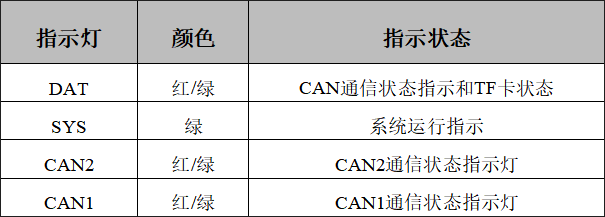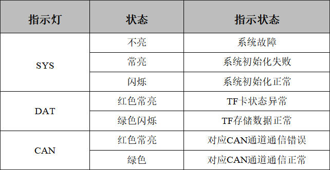 CAN總線數(shù)據(jù)存儲(chǔ)器具有1個(gè)SYS指示燈用來(lái)指示系統(tǒng)運(yùn)行狀態(tài),1個(gè)DAT指示燈用來(lái)指示CAN總線數(shù)據(jù)傳輸和TF卡狀態(tài)。2個(gè)CAN指示燈用來(lái)指示CAN總線數(shù)據(jù)傳輸狀態(tài)。這2個(gè)指示燈的具體指示功能見(jiàn)下表,這2個(gè)指示燈處于各種狀態(tài)的含義如下表所示。