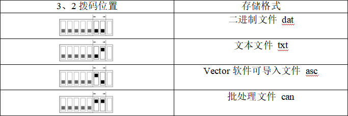 CAN總線數(shù)據(jù)存儲(chǔ)器支持四種保存數(shù)據(jù)格式:二進(jìn)制文件(.DAT)、文本文件(.TXT)、Vector軟件可導(dǎo)入文件(.ASC)、批處理文件(.CAN)可通過(guò)8位撥碼開(kāi)關(guān)中的第三和二個(gè)開(kāi)關(guān)切換,如圖所示。