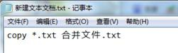 以合并文本文件(.txt)為例,在想要合并文件的文件夾中新建一個(gè)文本文檔,文檔中輸入以下內(nèi)容:copy*.txt合并文件.txt(“合并文件.txt”就是最后生成的合并文件,名字可以任意修改)如圖: