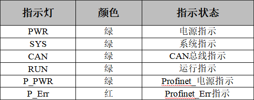 GCAN-GT-8321的正面突出區(qū)域包含6個(gè)圓形狀態(tài)指示燈。指示燈的具體指示功能見(jiàn)下表。
