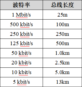 請(qǐng)注意:CAN-bus電纜可以使用普通雙絞線、屏蔽雙絞線。理論最大通信距離主要取決于總線波特率,最大總線長(zhǎng)度和波特率關(guān)系詳見(jiàn)下表。若通訊距離超過(guò)1km,應(yīng)保證線的截面積大于Φ1.0mm2,具體規(guī)格應(yīng)根據(jù)距離而定,常規(guī)是隨距離的加長(zhǎng)而適當(dāng)加大。