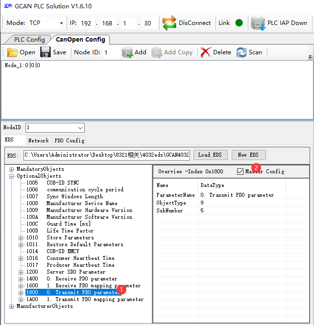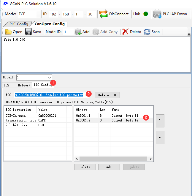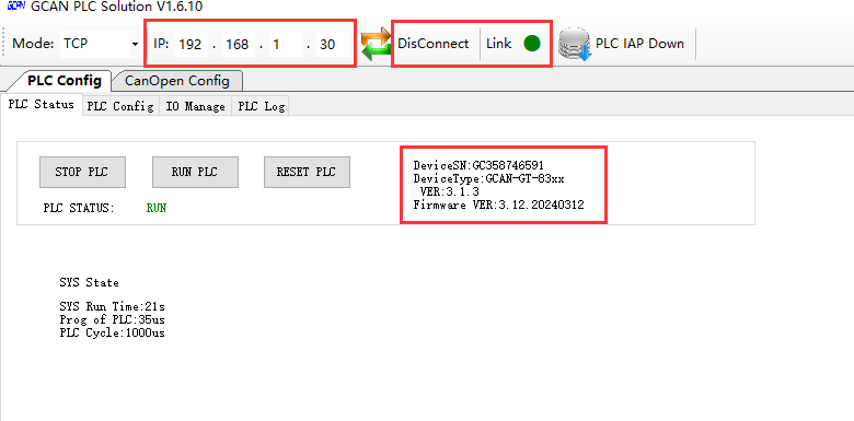 8321的以太網(wǎng)口連接至上位機(jī),CAN口連接從站4032,打開(kāi)上位機(jī)軟件GCAN_PLC_Solution:默認(rèn)IP,使用以太網(wǎng)接口連接8321設(shè)備: