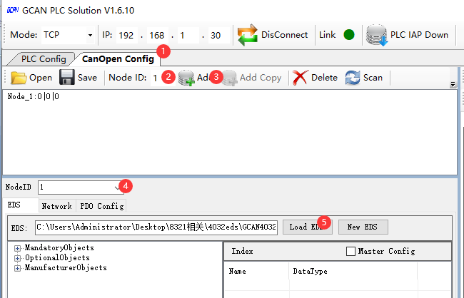 打開(kāi)CANopen配置頁(yè)面,添加4032對(duì)應(yīng)節(jié)點(diǎn)id,導(dǎo)入4032的eds文件: