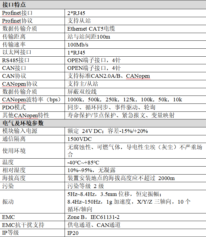 (1)2個(gè)Profinet總線接口(RJ45);(2)Profinet總線傳輸速率:100Mbps;(3)Profinet總線傳輸距離(站與站間距):100m;(4)1個(gè)CAN總線接口,1個(gè)485總線接口,1個(gè)以太網(wǎng)總線接口;(5)通過(guò)配置軟件配置Profinet從站轉(zhuǎn)CAN或CANopen模式;(6)通過(guò)配置軟件配置Profinet從站轉(zhuǎn)Modbus TCP或Modbus RTU模式;(7)PDO模式支持同步、循環(huán)同步、事件驅(qū)動(dòng)、輪詢等;(8)電源采用24V DC(-15%/+20%);(9)電氣隔離為1500 VDC;(10)工作溫度范圍:-40℃~+85℃;(11)相對(duì)濕度:10%~95%,無(wú)凝露;(12)EMC:Zone B,IEC61131-2;(13)IP等級(jí):IP20