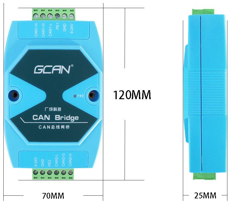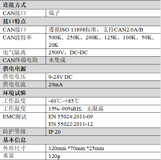 GCAN-216模塊使用時(shí)不需要修改波特率,屬于自適應(yīng)形式,波特率支持范圍為10K-500K,輸入和輸出波特率必須一致。設(shè)備使用時(shí)只需接好CAN線和電源線。(接線為CANH-CANH,CANL-CANL,供電電壓為DC9-24V)六、技術(shù)規(guī)格