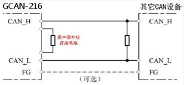 請注意:GCAN-216模塊內(nèi)部未集成120Ω終端電阻,模塊外部提供電阻接線端子。需要接入終端電阻時(shí),將電阻兩端分別接入CAN_L、CAN_H即可。