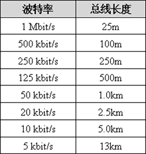 注意:CAN-bus電纜可以使用普通雙絞線、屏蔽雙絞線。理論最大通信距離主要取決于總線波特率,最大總線長度和波特率關(guān)系詳見表。若通訊距離超過1Km,應(yīng)保證線的截面積大于Φ1.0mm2,具體規(guī)格應(yīng)根據(jù)距離而定,常規(guī)是隨距離的加長而適當(dāng)加大。