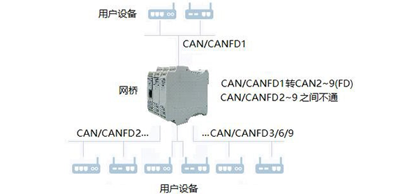 ● 網(wǎng)橋系列GCAN-GT-418產(chǎn)品,具有3/6/9個電氣隔離的CAN/CANFD總線接口,1路以太網(wǎng)接口。CAN/CANFD1作為主節(jié)點,CAN/CANFD 2~3/2~6/2~9作為從節(jié)點,每個從節(jié)點最多可以帶32個CAN設(shè)備。主節(jié)點和從節(jié)點的波特率可以自由配置,實現(xiàn)CAN/CANFD網(wǎng)絡(luò)的網(wǎng)橋功能,可以將不同速率的CAN/CANFD網(wǎng)絡(luò)數(shù)據(jù)轉(zhuǎn)發(fā)到CAN/CANFD1通道;