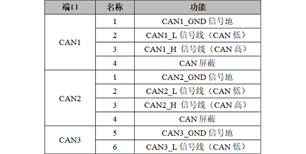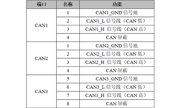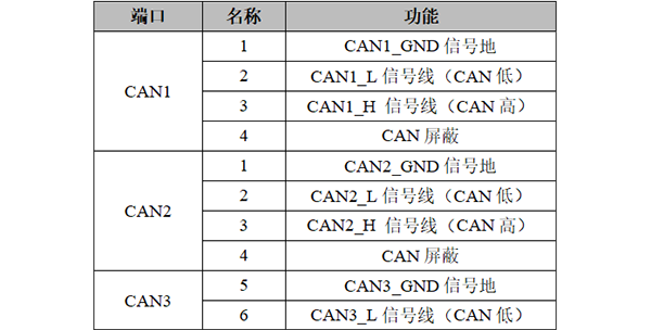 GCAN-GT-418-3系列模塊CAN/CANFD接口由3個4Pin接線端子引出,有3個獨立的CAN/CANFD接口,其接口定義如下表所示。