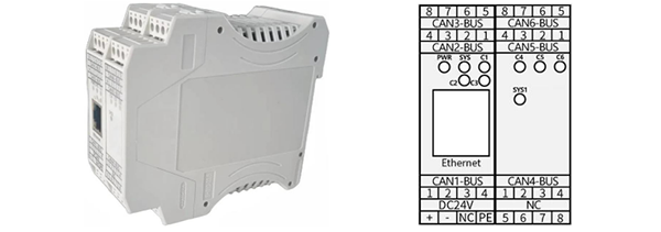 GCAN-GT-418-6系列模塊硬件一致:集成1路DC24V電源接口、6路標(biāo)準(zhǔn)CAN/CANFD接口、1路標(biāo)準(zhǔn)太網(wǎng)接口,GCAN-GT-418-6系列模塊接線端子排如下圖所示。
