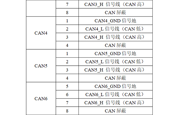 GCAN-GT-418-6系列模塊CAN/CANFD接口由6個4Pin接線端子引出,有6個獨立的CAN/CANFD接口,其接口定義如下表所示。