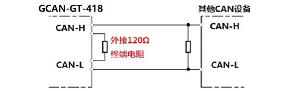請注意:GCAN-GT-418系列模塊的CAN總線內(nèi)部未集成120Ω終端電阻。如果節(jié)點數(shù)目大于2,中間節(jié)點不需要安裝120Ω的終端電阻。需要使用時,將電阻兩端分別接入CAN_H、CAN_L即可,如下圖所示。
