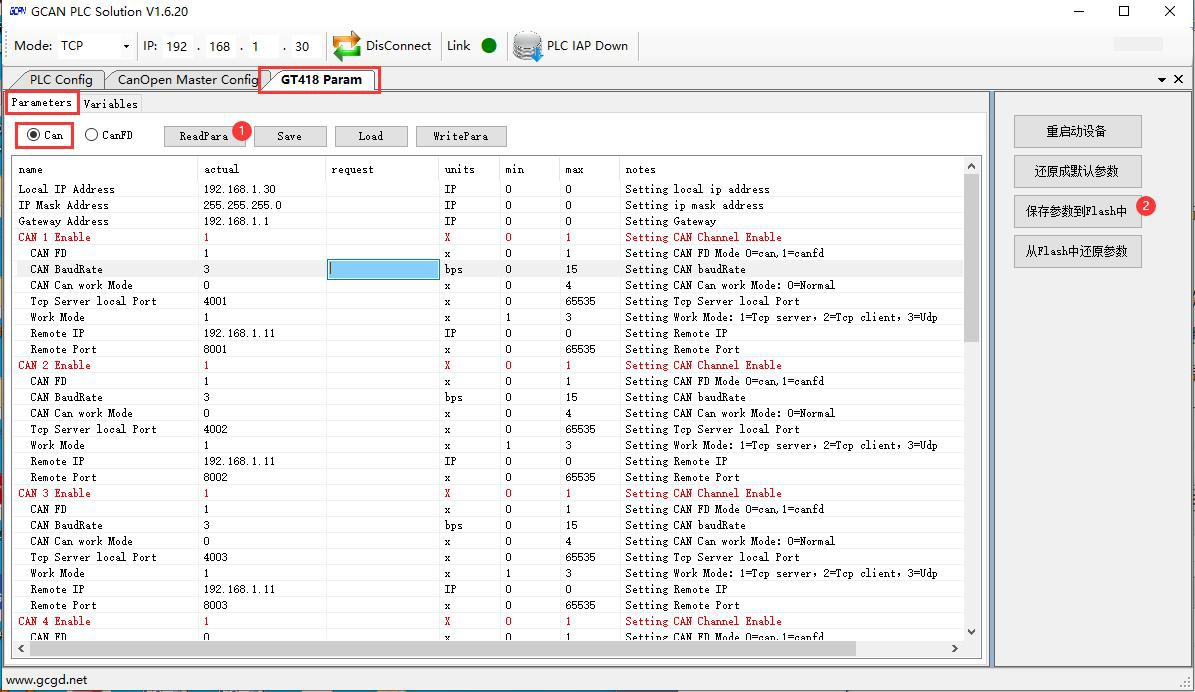 (1)打開GCAN_PLC_Solution軟件,Mode選擇TCP模式,418的網(wǎng)口連接上位機,輸入418的IP地址(出廠默認192.168.1.30),點擊“Connect”按鈕。連接成功后會顯示418的相關(guān)參數(shù)信息。