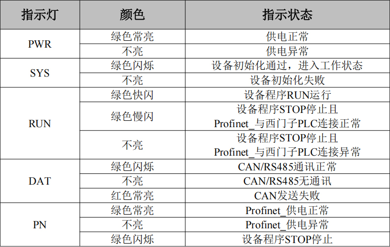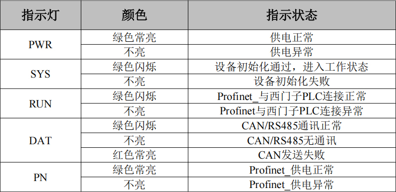 GCAN-GT-8321S的正面突出區(qū)域包含5個方形狀態(tài)指示燈。指示燈的具體指示功能及不同狀態(tài)下時,GCAN-GT-8321S模塊狀態(tài)如表2.2、2.3所示。
