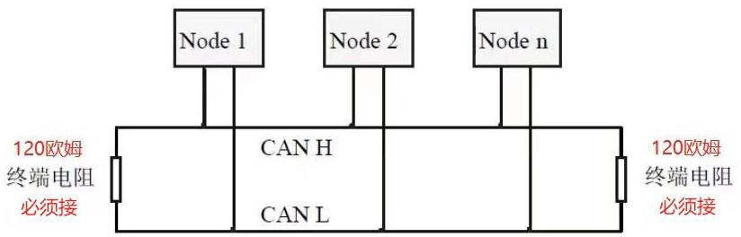 CAN-bus網(wǎng)絡(luò)采用直線拓?fù)浣Y(jié)構(gòu),總線最遠(yuǎn)的2個終端需要安裝120Ω的終端電阻;如果節(jié)點(diǎn)數(shù)目大于2,中間節(jié)點(diǎn)不需要安裝120Ω的終端電阻。對于分支連接,其長度不應(yīng)超過3米。CAN-bus總線的連接如圖4.3所示。