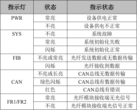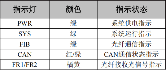 GCAN-208-2C系列模塊具有1個(gè)PWR指示燈用來(lái)指示系統(tǒng)供電情況,1個(gè)SYS指示燈用來(lái)指示設(shè)備的運(yùn)行狀態(tài),1個(gè)FIB指示燈用來(lái)指示光纖數(shù)據(jù)傳輸,2個(gè)FR指示燈用來(lái)指示光纖模塊接收光信號(hào)狀態(tài),1個(gè)CAN指示燈用來(lái)指示CAN總線數(shù)據(jù)傳輸。這5個(gè)指示燈的具體指示功能見(jiàn)表3.3,這5個(gè)指示燈處于各種狀態(tài)的含義如表3.4所示。