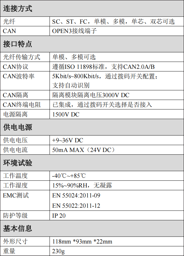 (5)CAN總線通訊波特率在5Kbps~800Kbps之間可通過(guò)撥碼開(kāi)關(guān)配置;(6)CAN總線接口采用電氣隔離,隔離模塊隔離電壓:3000V DC;