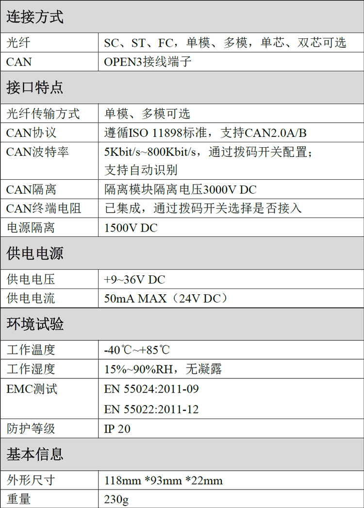 2)GCAN-208-2-F系列光纖支持CAN總線網(wǎng)絡(luò)的中繼擴(kuò)容,傳輸距離20km;支持不同波特率的CAN總線網(wǎng)絡(luò),CAN波特率支持5Kbps~800Kbps;支持CANopen、SAE J1939、DeviceNet、NMEA2000等任何CAN總線通信協(xié)議。