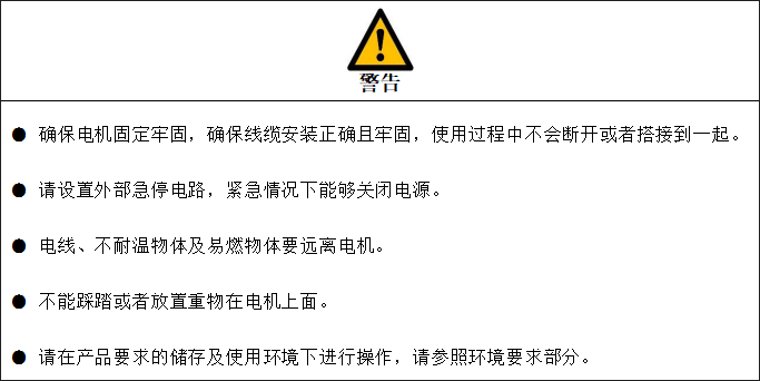 建議電機(jī)先進(jìn)行空載操作,試轉(zhuǎn)沒問題后,再加入負(fù)載進(jìn)行操作,若試轉(zhuǎn)過程中,電機(jī)噪音過大,抖動(dòng)過大,或者有任何報(bào)警情況,請與廠家聯(lián)系。