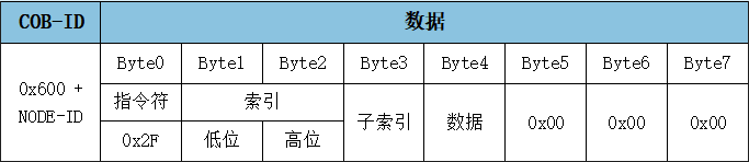 報(bào)文:ID:0x601數(shù)據(jù):2F 60 60 00 06 00 00 00,設(shè)置0x6060為6,