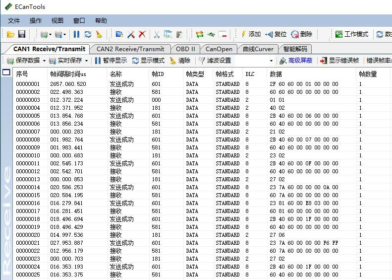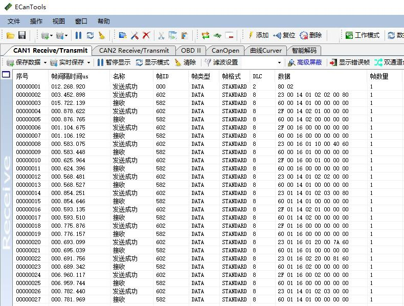 報(bào)文:ID:0x601數(shù)據(jù):23 FF 60 00 E8 03 00 00,單位0.1rpm,即轉(zhuǎn)速為1000*0.1rpm。