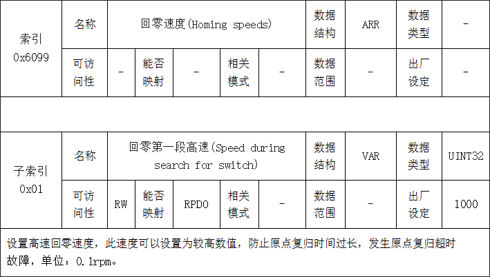 報(bào)文:ID:0x601數(shù)據(jù):23 99 60 01 B8 0B 00 00,設(shè)置回零第一段速度為3000*0.1rpm。